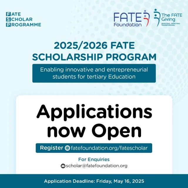 The FATE Foundation has officially opened applications for the 2025/2026 FATE Scholar Programme (FSP), a fully funded initiative aimed at supporting young, innovative Nigerians pursuing undergraduate studies in STEAM (Science, Technology, Engineering, Arts, and Mathematics) fields at accredited public tertiary institutions across Nigeria.